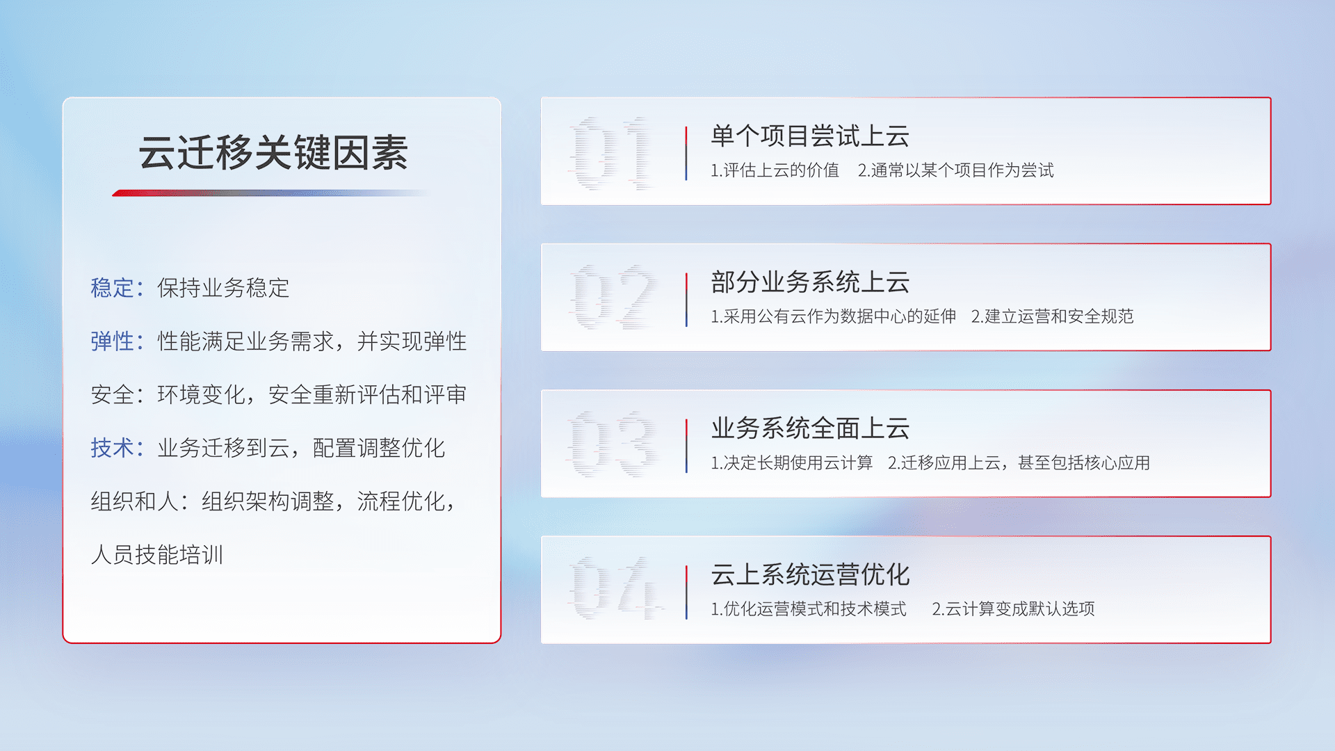 结合实际业务,,,从规划设计、、、云平台选型、、云原生改造、、、数据迁移、、、、集成交付,,迁移全过程为客户识别最佳上云路径,,,做好风险识别管理,,设计网络架构、、、身份权限、、、、安全审计合规、、操作审计、、日志审计、、监控告警策略、、、、多站点容灾设计等,,,,对云上基础设施进行整体规划,,,,提升IT治理水平,,以满足弹性、、、、高可用、、、高性能的需求。。