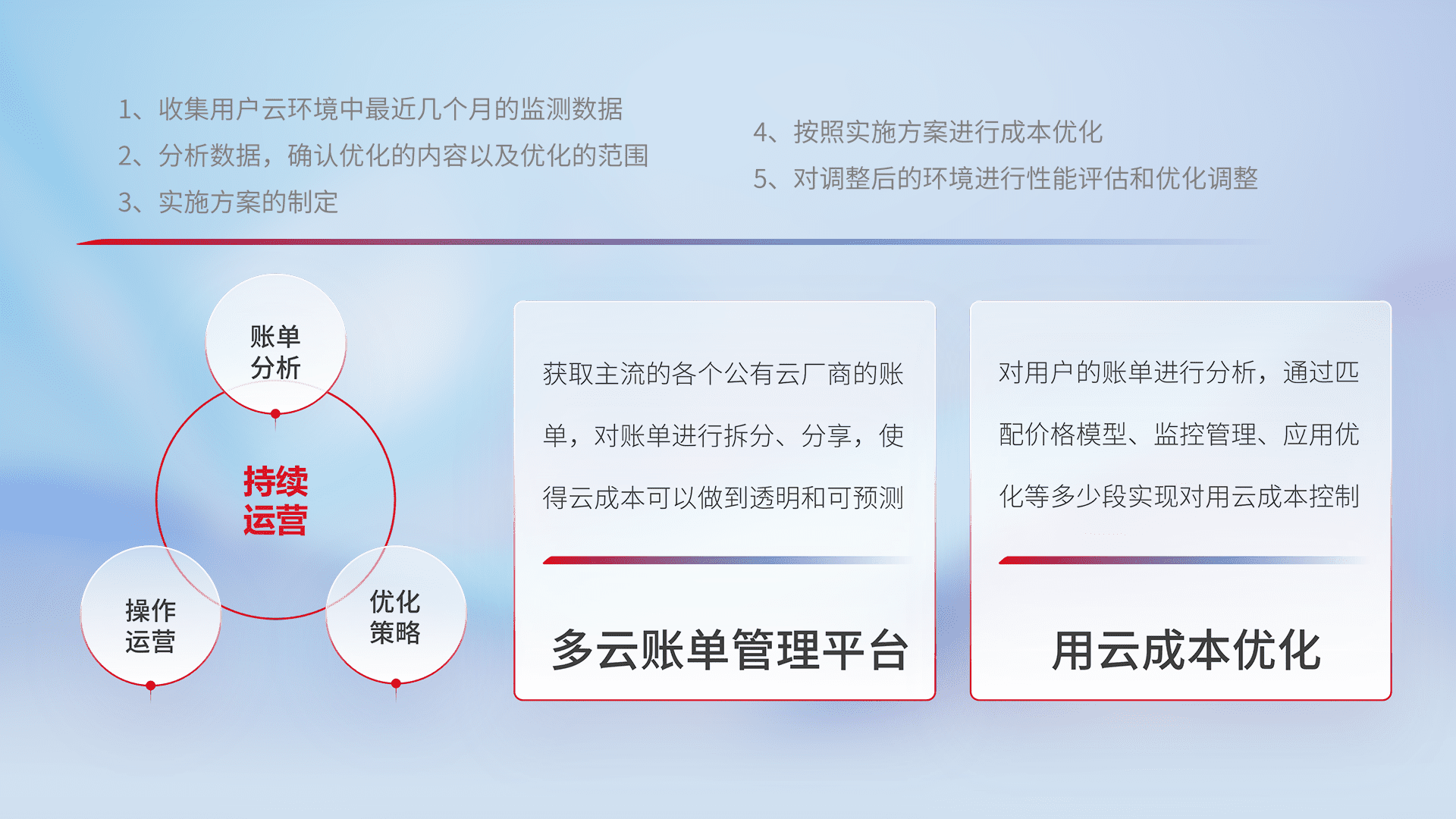 通过多云纳管,,,,以统一的资源数据模型把客户的云资源进行抽象和封装,,,,进而实现对多云资源的统一操作,,,保障云资源管理的可靠性、、、稳定性与可用性。。。量身定制化运维内容,,配置、、、、开发运维、、、补丁管理、、备份、、监控、、认证和访问管理、、、、审计和日常巡检等,,,保障在用云过程中的可靠度,,稳定度以及高可用率。。。
